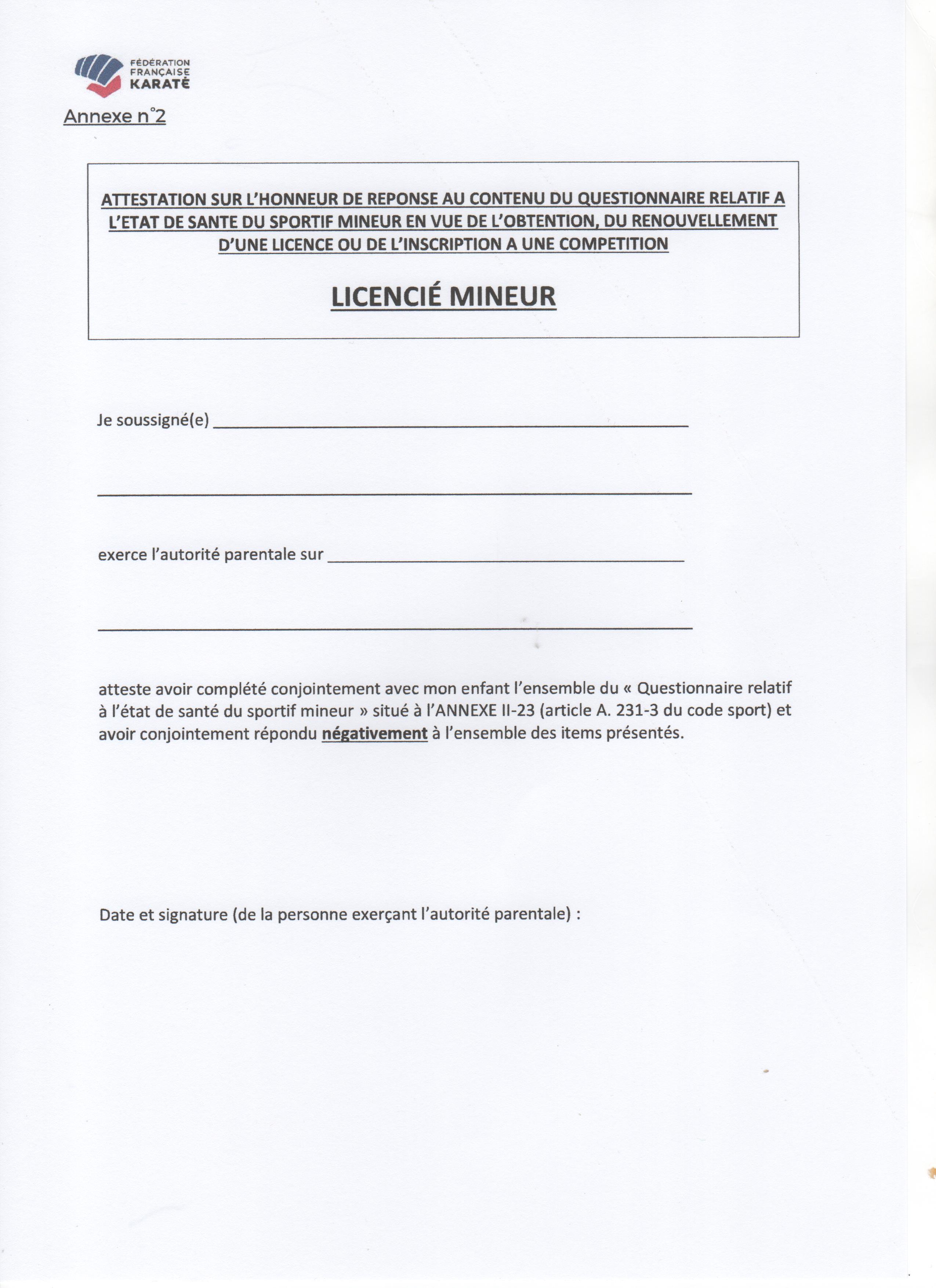 Attestation sur L'honneur d'Aptitude au sport Licencié Mineur