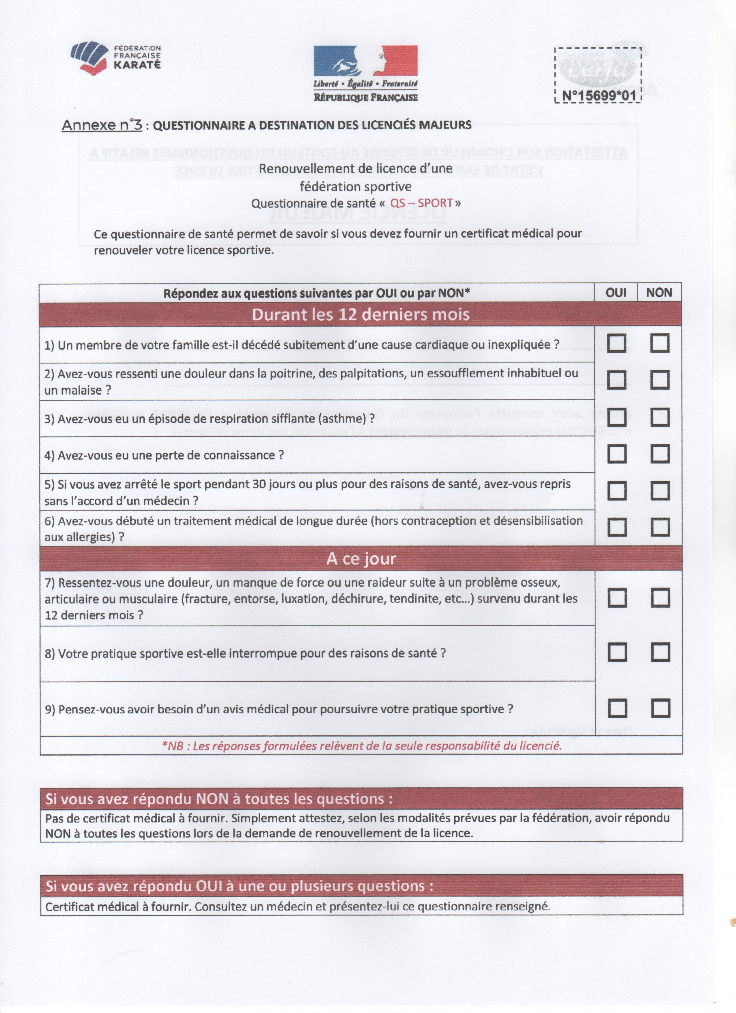 3/ Si une ou plusieurs réponses sont positives, il faudra un nouveau certificat médical.