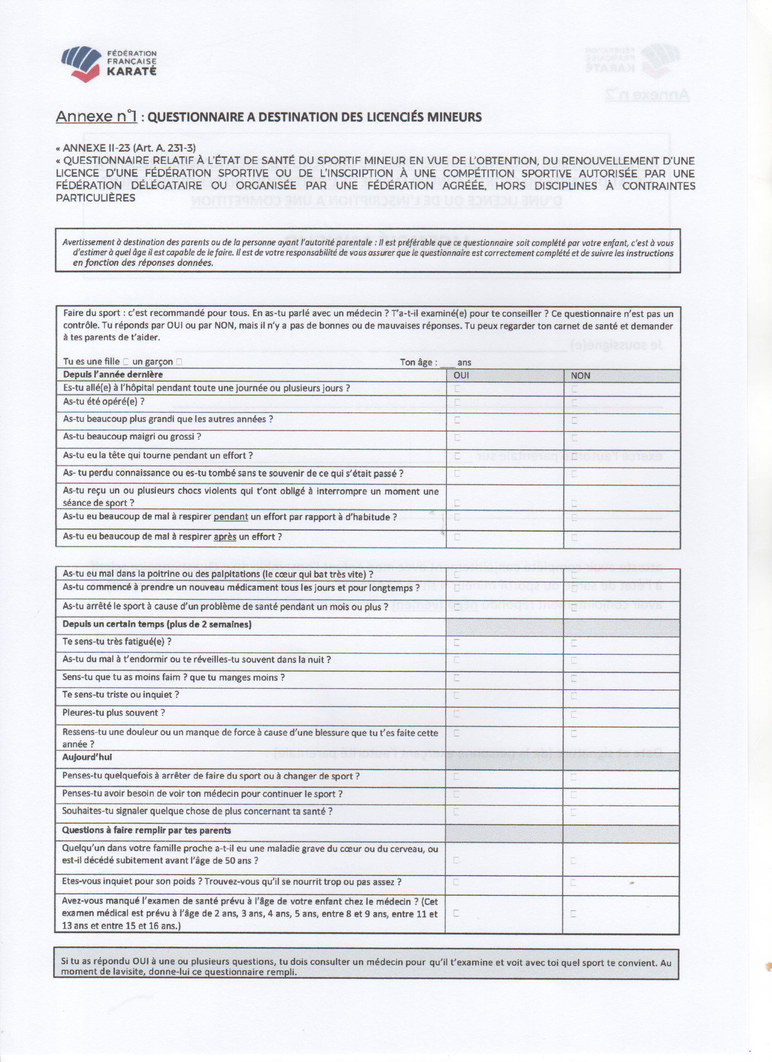 Questionnaire Licencié Mineur